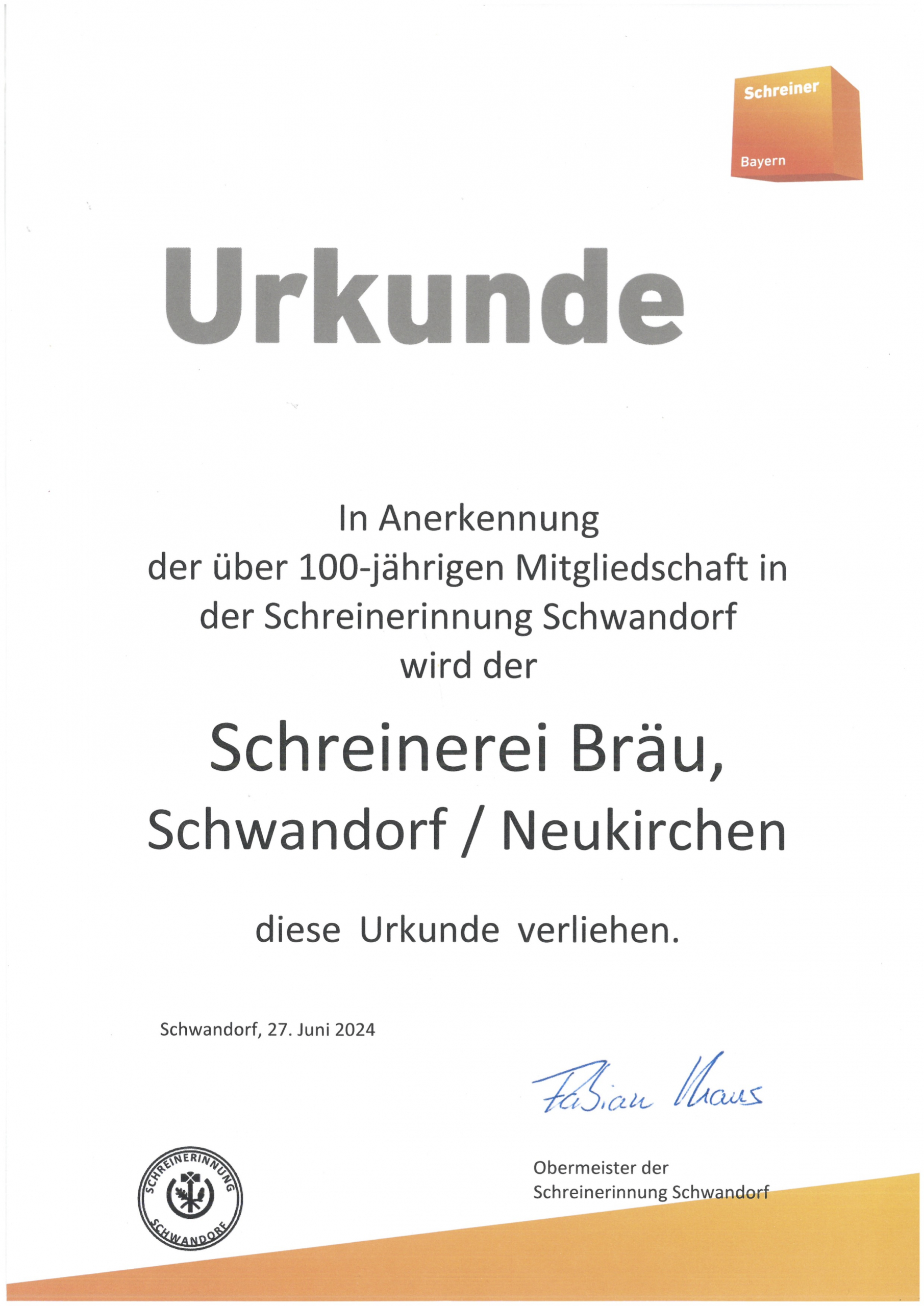 Am 27. Juni 2024 wurde der Schreinerei Bräu (Schwandorf/ Neukirchen) eine Urkunde als Anerkennung für 100 Jahre Mitgliedschaft in der Schreinerinnung Schwandorf verliehen.